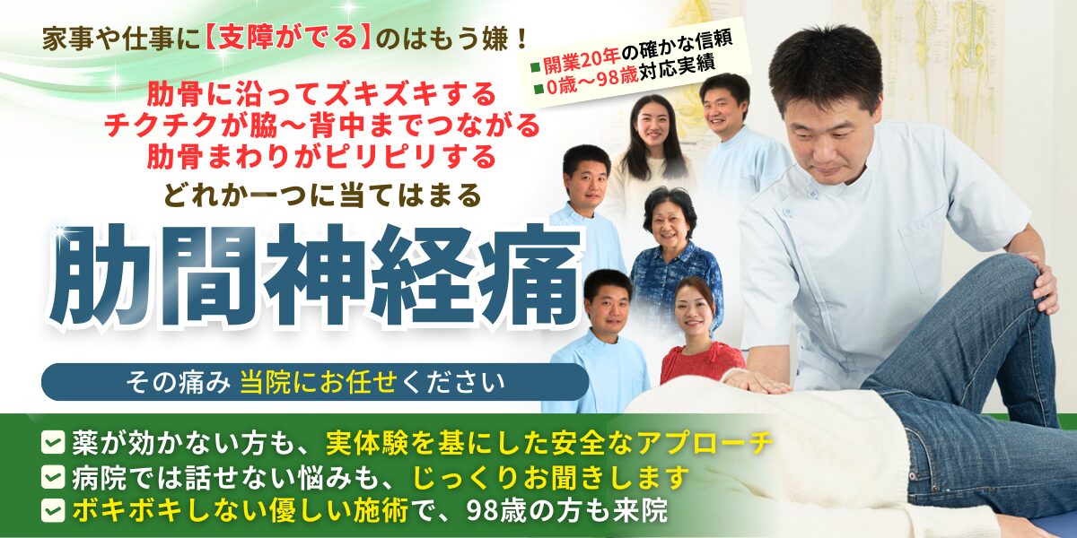 「息を吸うだけで脇腹が痛む」「鋭い痛みで動くのが怖い」…病院で検査をしても「骨には異常なし」と言われ、湿布や鎮痛剤だけで様子を見ている。そんな肋間神経痛の症状にお悩みではありませんか?