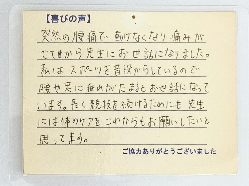 その時はよろしくお願いします。P.S. 今まで骨が曲がっていたせいか、 背筋を伸ばしてまっすぐ立つという感覚がわかりませんでしたが、初日の施術後に背筋を伸ばすということができるようになりました。感謝しています。