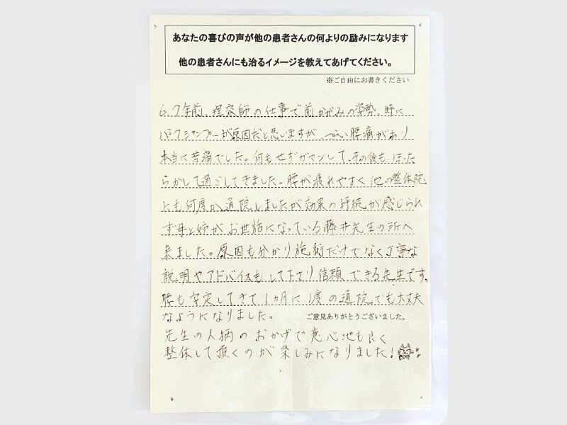 筋肉疲労やハリはもちろん、背骨や首の骨の歪みや痛み、腰の痛み、ムチウチ、膝や足や腹筋周辺の痛みなど、いろいろな痛みなどで来院しましたが、藤井先生には全てに対処して頂きました。