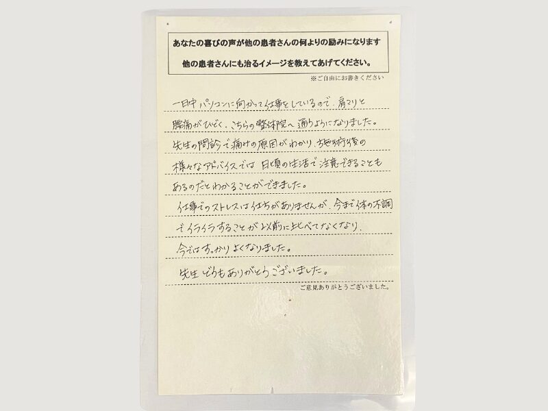 施術後、あなたの体の状況やどのような施術を行ったかをご説明します。またご自分でできる対策などをアドバイスします。